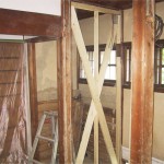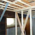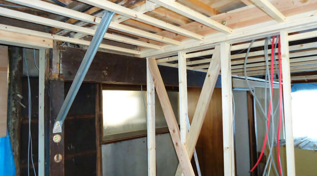構造用合板を貼りつけたり、筋違を入れることで壁の剛性を高めていきます。