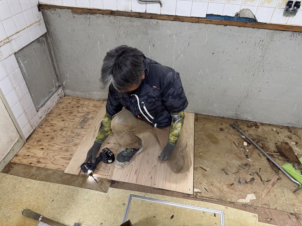 水の影響で傷んだ床をはがし新しい床下地を作っていきます。