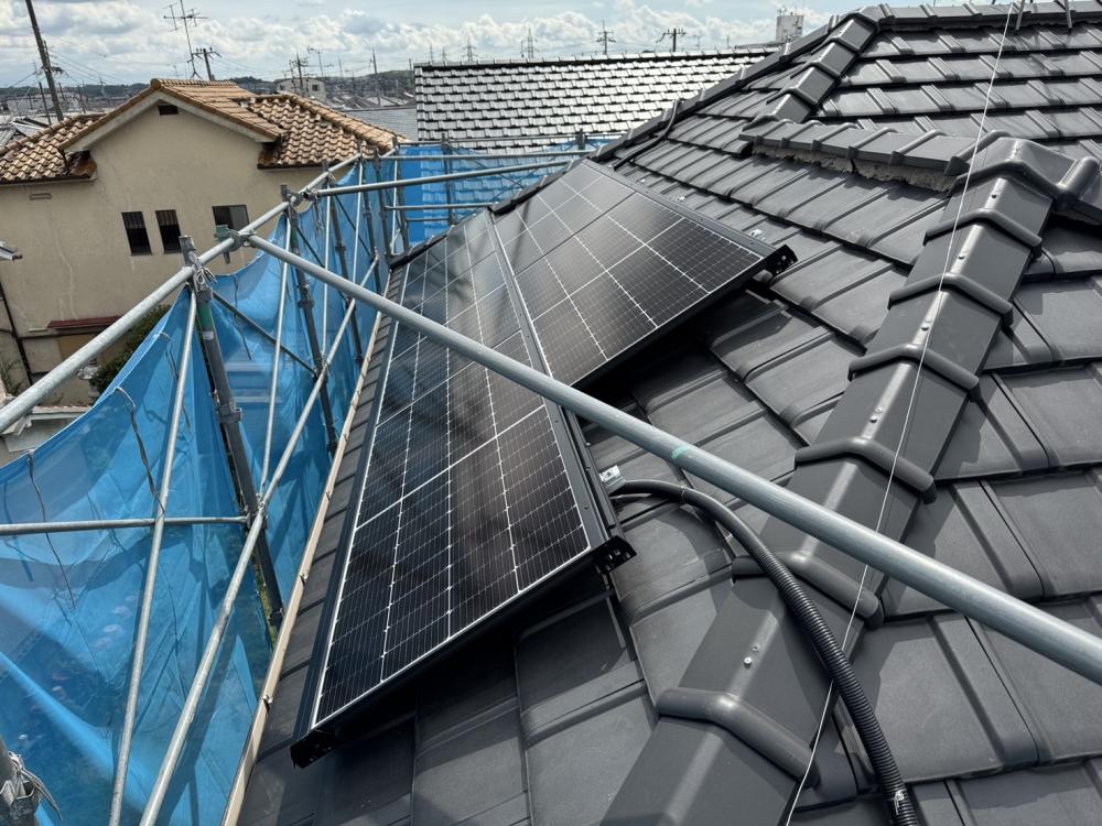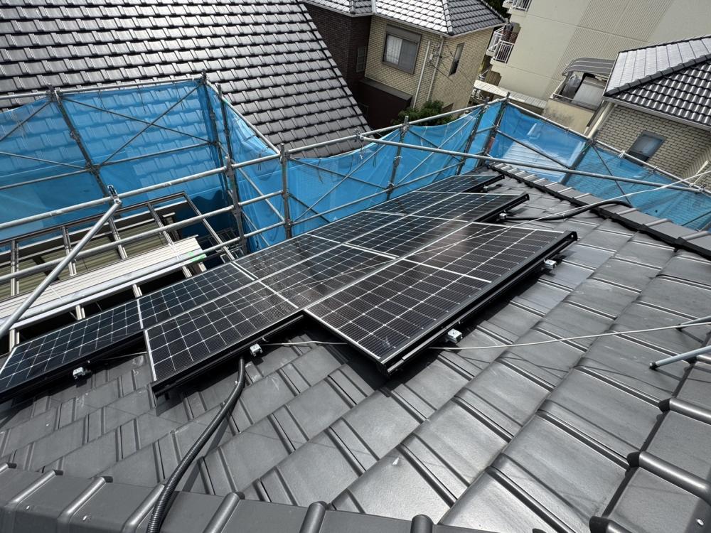 パネル設置完成です!屋根の形状が寄棟という形状で各面の設置枚数は少ないですが東、南、西と3面設置です!