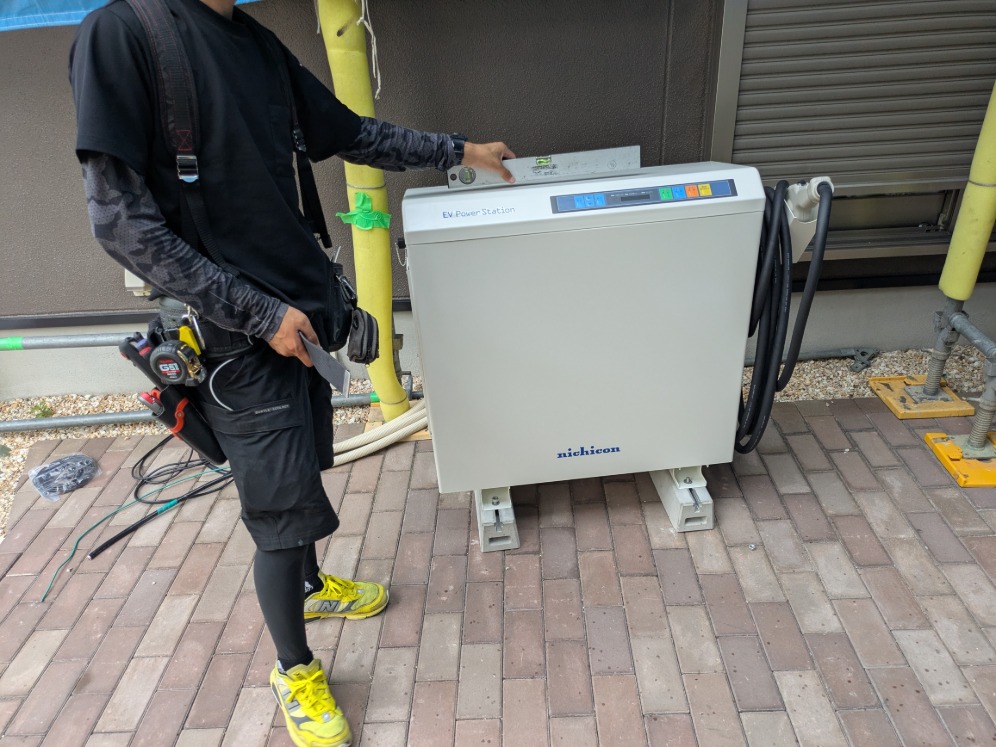 コンパクトなニチコンの据え置きタイプのV2Hです。車への充電と建物への送電が可能です!