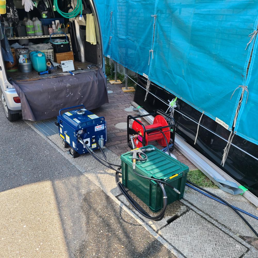 高圧洗浄で古くなった塗膜や表面に付いた汚れなどを洗い流します。