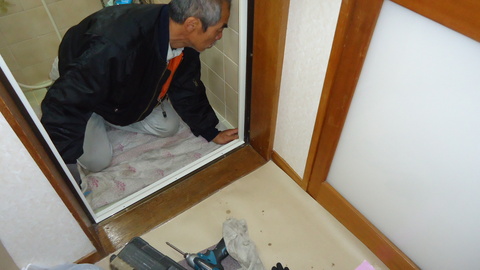 | 依頼の内容 | 浴室ドア取り換え工事:古くなりスムーズに開閉できなくなった折り戸を外し枠を取り付け新しい折り戸を設置していきます! |