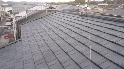 雨漏りはしていませんでしたがスレート瓦がかなり劣化している状況でした。素材は同じスレートですが表面の特殊コーティングが超耐久性を発揮し重厚感ある仕上がりを実現できます!