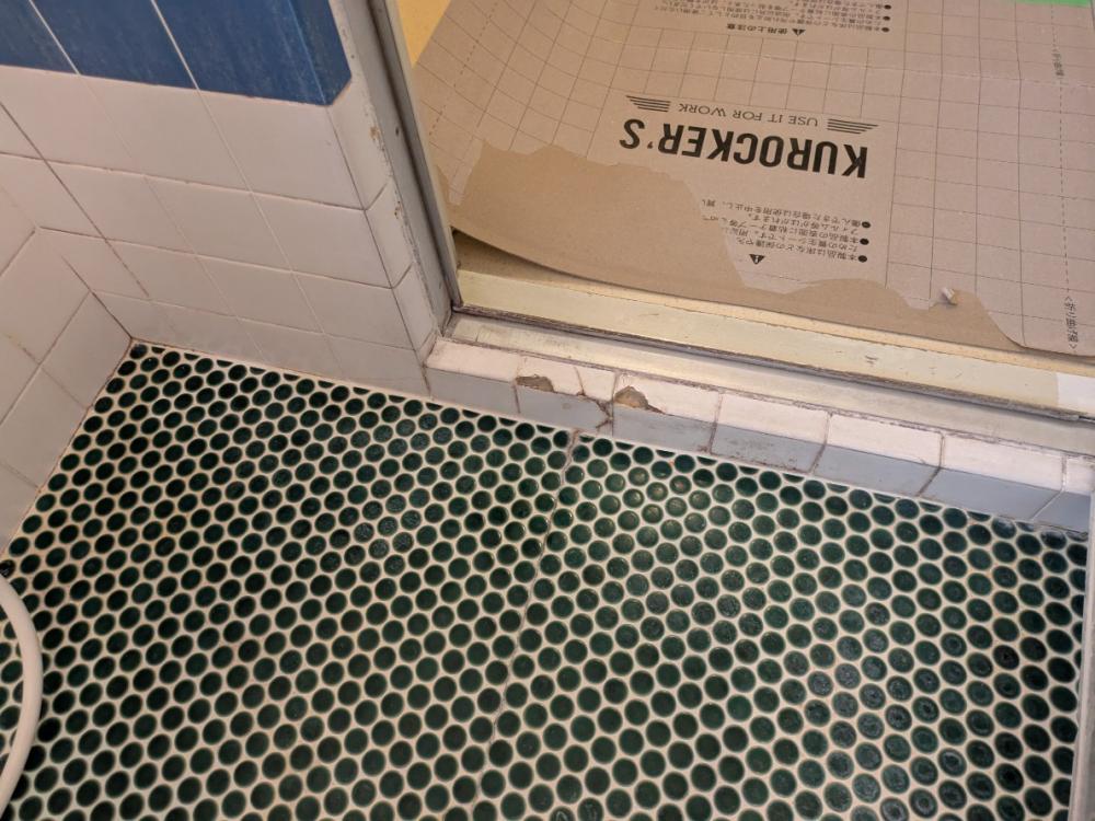 解体前のお風呂場の入り口付近の段差の様子です、こちらも経年の劣化で所々欠けている部分が見受けられます