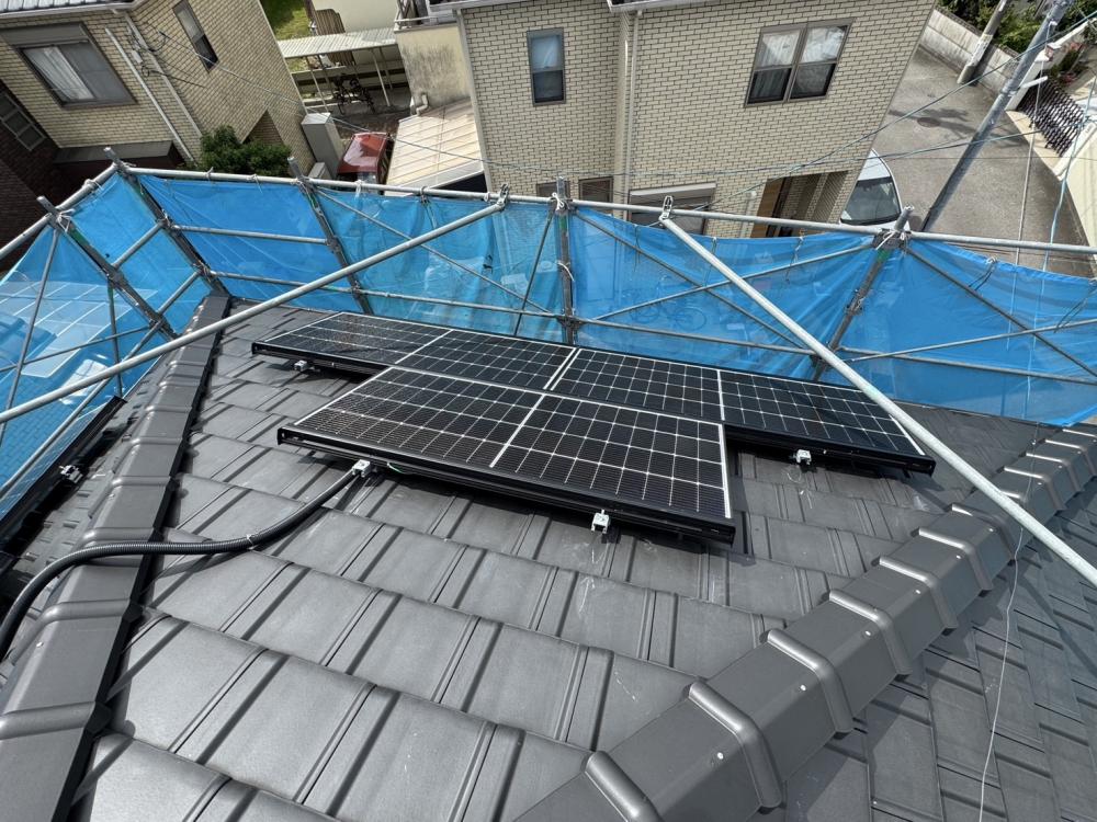 パネル設置完成です!屋根の形状が寄棟という形状で各面の設置枚数は少ないですが東、南、西と3面設置です!