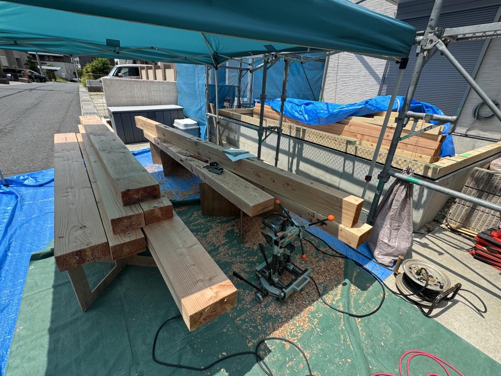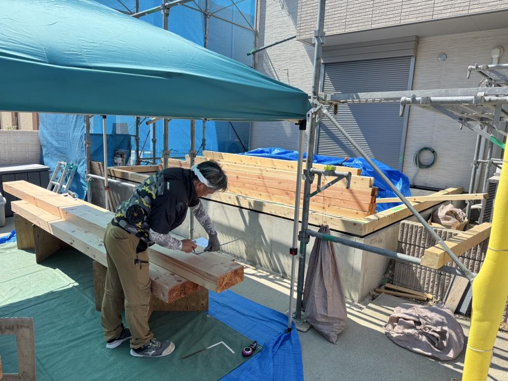 引き続き、建物の主要構造を担う柱や梁などを組み上げるため、大工さんによる刻み作業です!