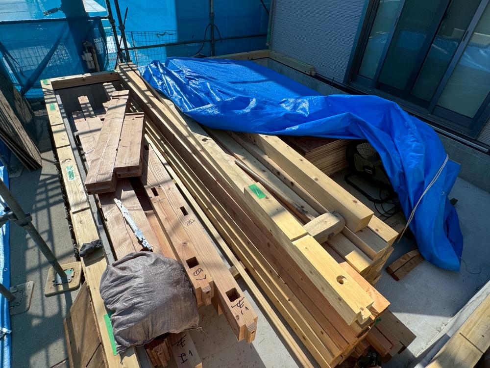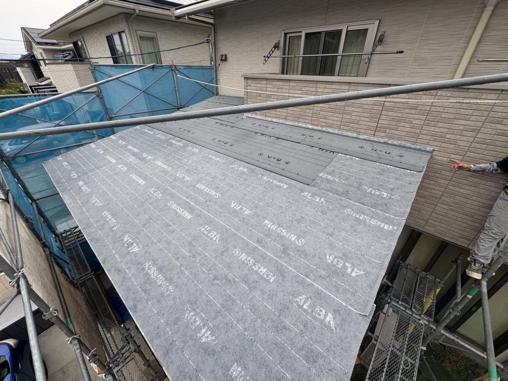- 屋根仕上げ前の防水シートの状況ですね、しっかりと敷き詰めていきます。