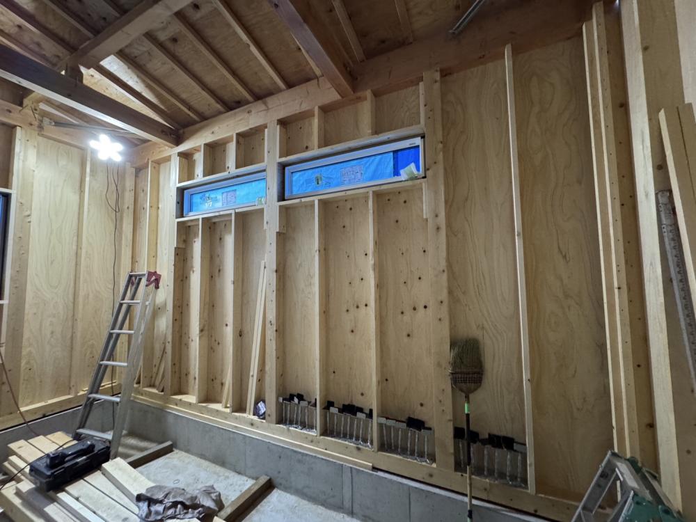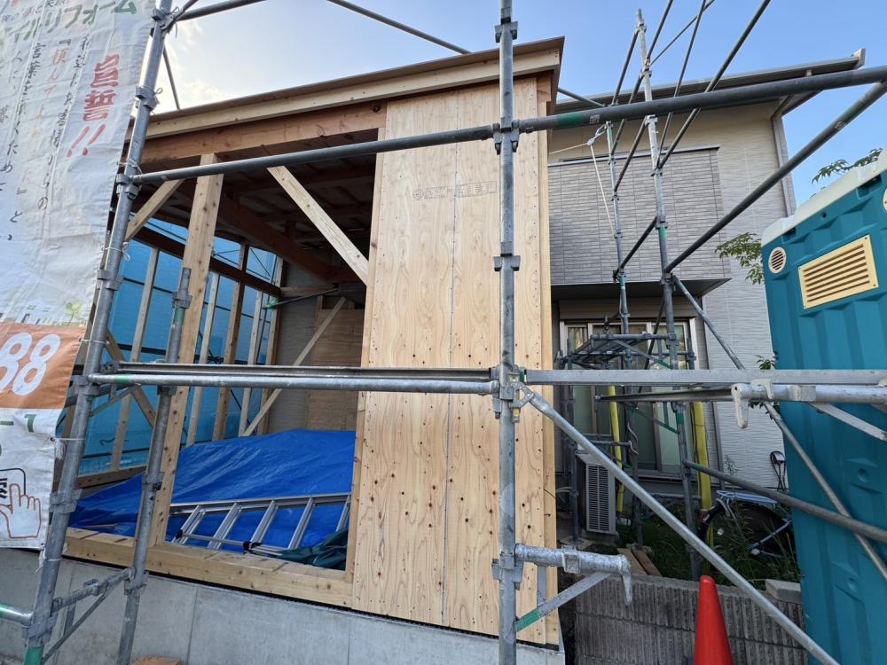 - 外壁の下地の下地が仕上がってきました、屋根と外壁の形ができると、建物としてのイメージが出てきます。