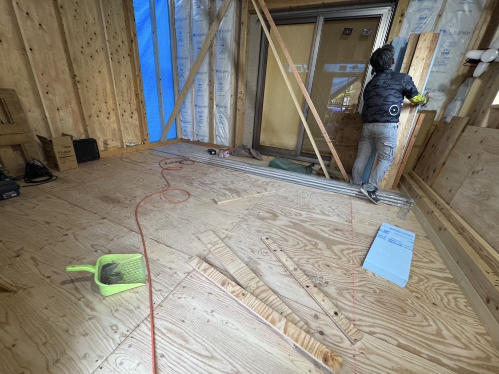 - 床下地が完成するとフローリング施工前の遮音シートを敷き詰めていきます!