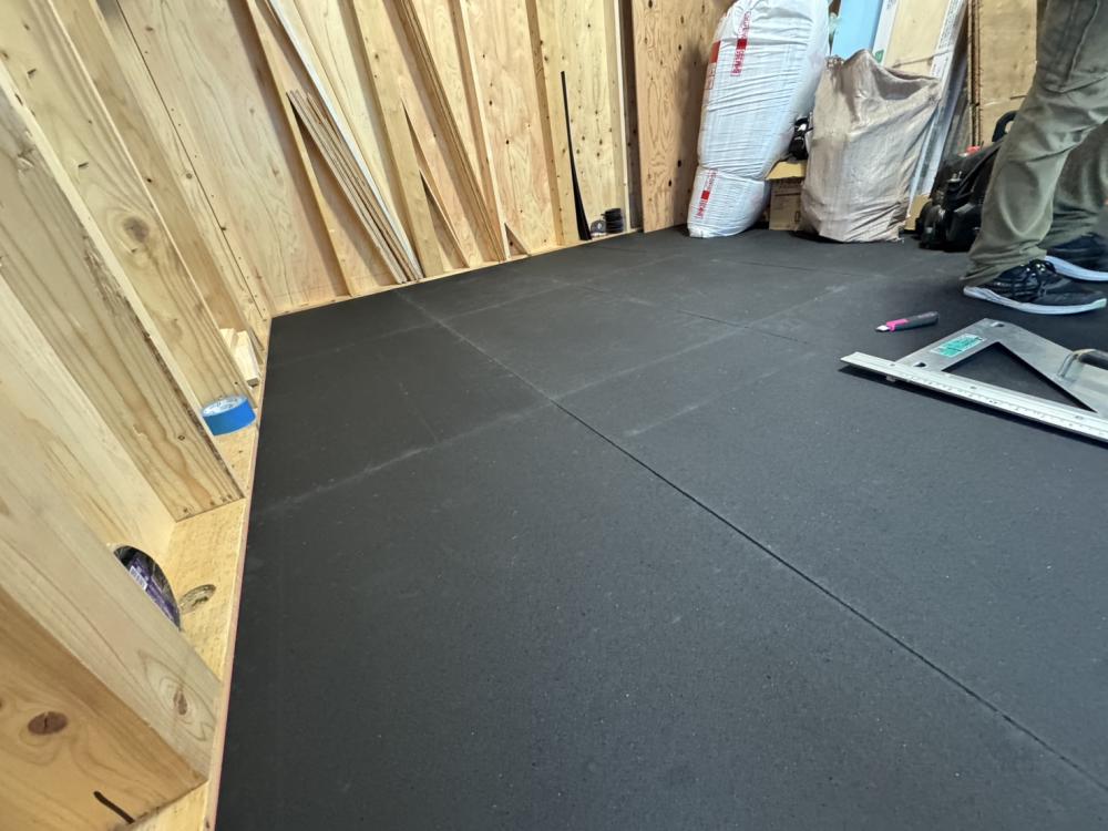 - 床の下地が完成しました!この上に防音効果を発揮する遮音シートと吸音材を敷き詰めていきます!