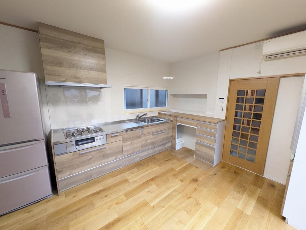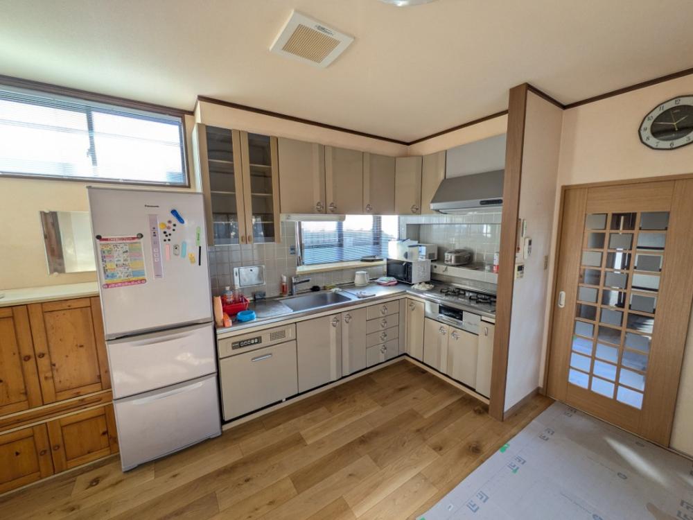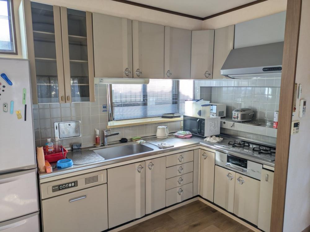 | 依頼のきっかけ | 30年使い続けたキッチンの扉などの傷みが激しかったことや、調理器具等の物が収納しきれなくなり機能性に富んだ収納力のあるキッチンへリフォームいたしました。食材を保管する場所や、テレビを見るスペースが無かったことからパントリーとテレビスペースも新たに設置いたしました。 |