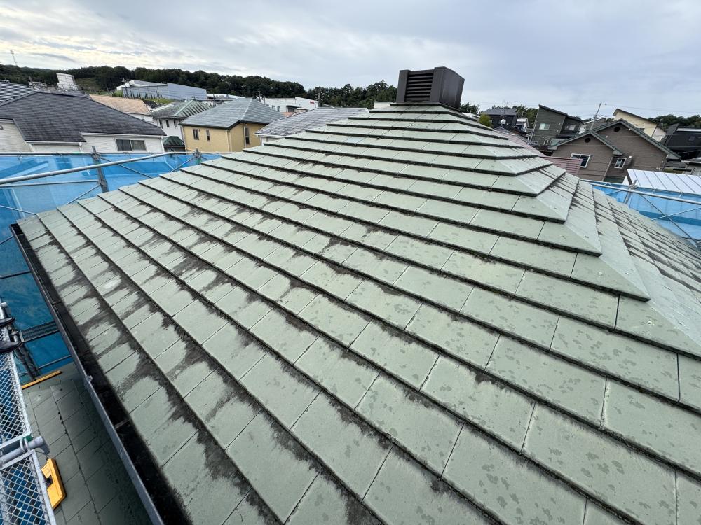 屋根材はスレート厚瓦のエアルーフドリームでした。長年の汚れやコケ、経年劣化が目立つ状況ですね。