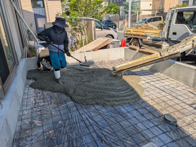 生コンを流して土間を造っていきます!均等にならして綺麗に仕上げていきます!
