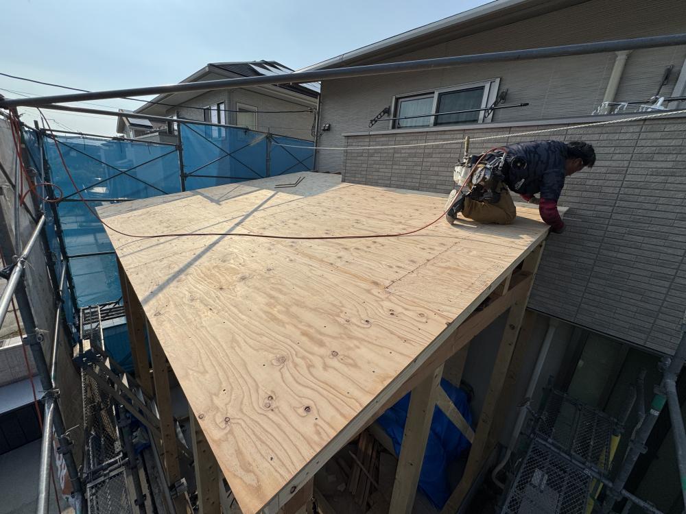 こちらは野地板を張っていますね。建前直後、まずは野地板から張っていきます。