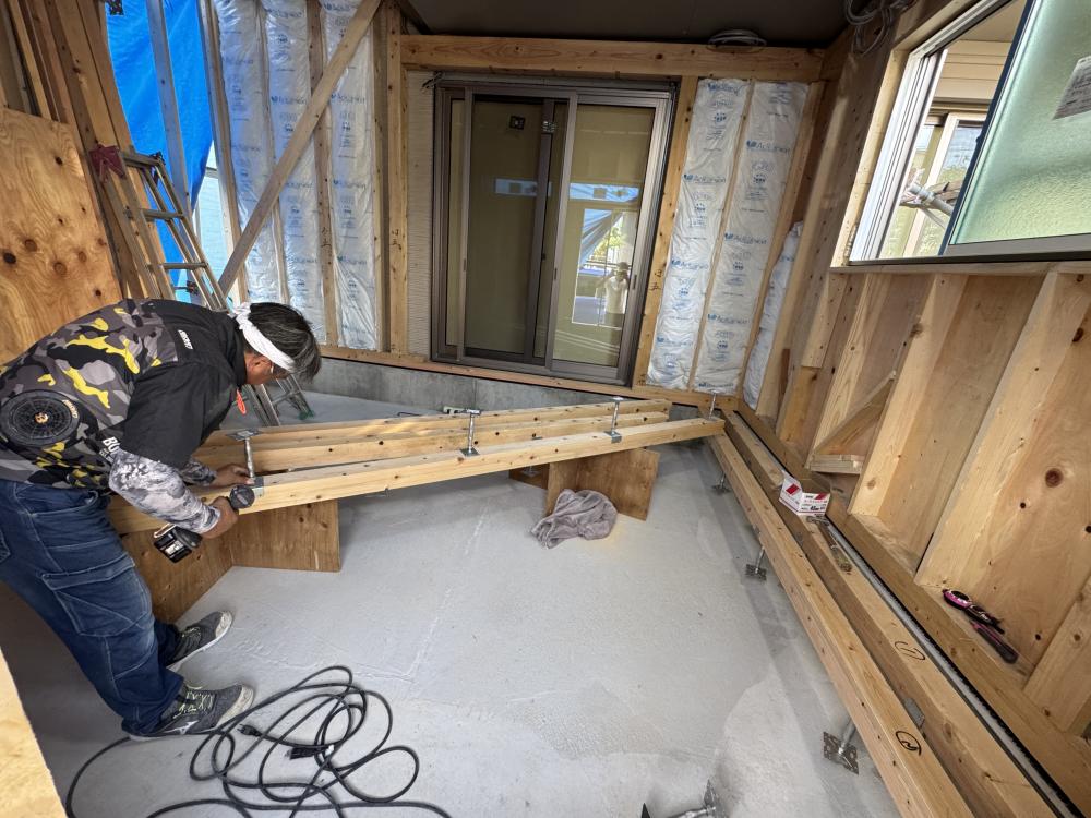 更にこの上に床を重ねていきます!床の上にさらに床を重ねていきます。この根太の間に入っているロックウールが吸音材になりますね。それでは引き続き増築工事、どんどん進めて参ります!