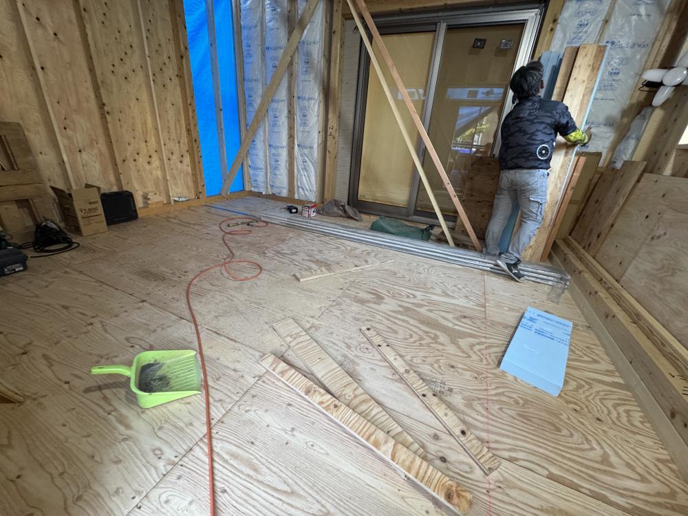 床の下地が完成致しました!これが第一層目です。大引きと根太の上に24㎜の合板を張っております。もちろん断熱材も入っております!