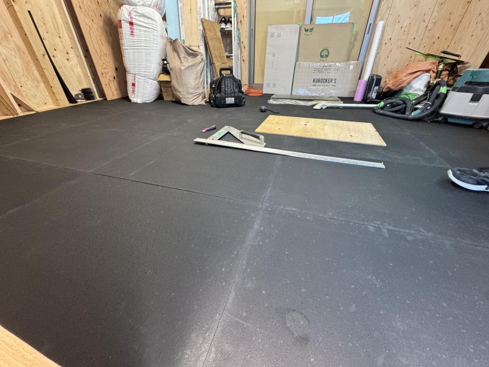 床は最後の下地で遮音マットを重ねます。この上から防音室用のフロア材を張っていきます。