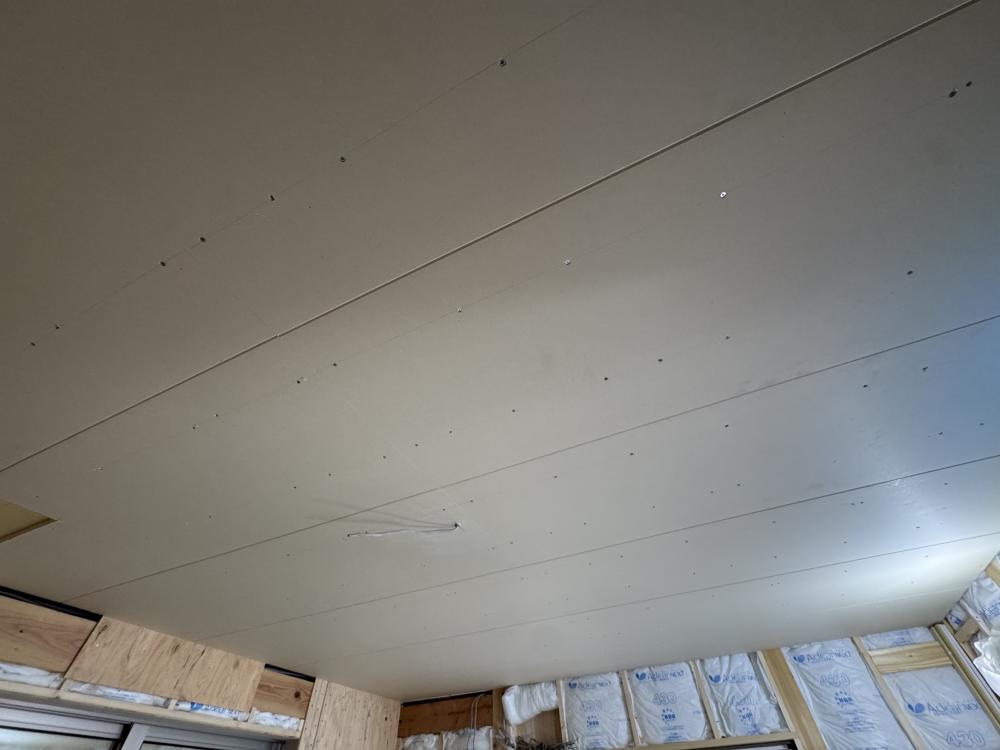 天井の2層目完成です!12㎜ボードの上に21㎜ボードを重ねて貼っております。まだまだ重ねていきますよ!