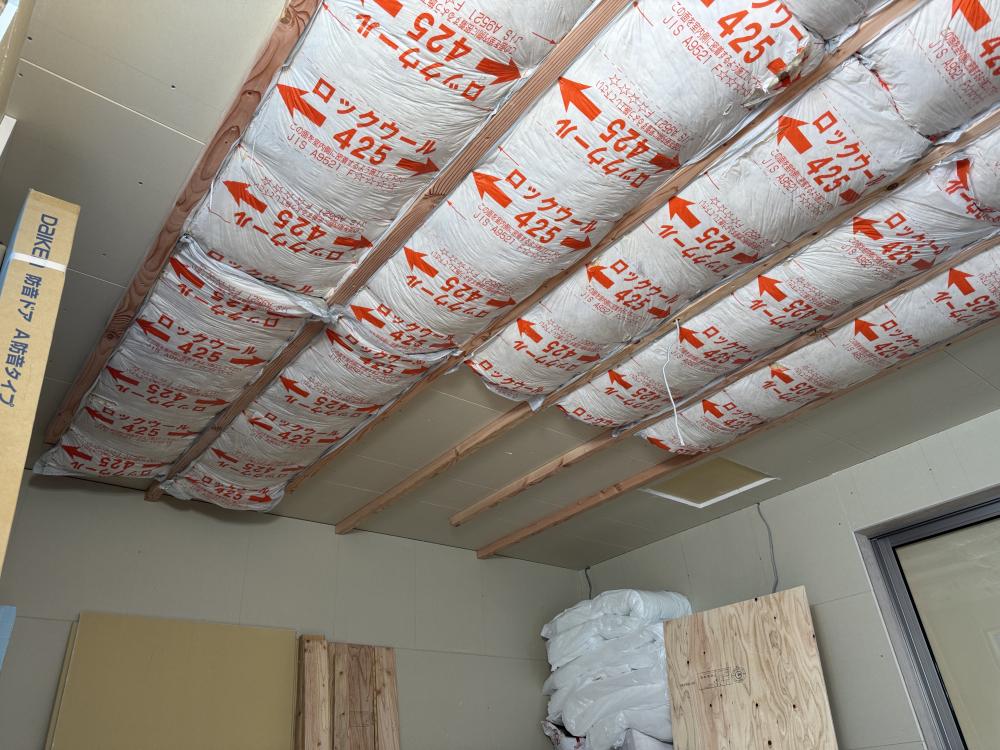天井地が組めて、断熱材を仕込んでいますね!床が完成したら次は天井に移って参ります。しっかり隅々まで断熱材を仕込んでいきます!