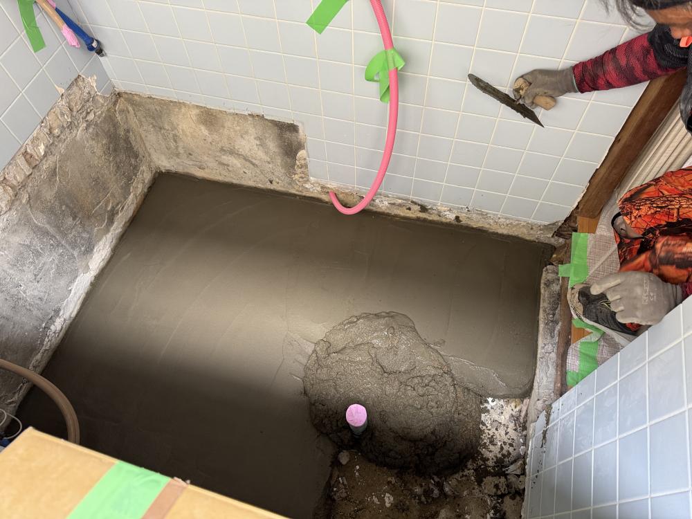 それでは土間打ち開始です!ユニットバスを水平に据えれるように安定した足場が必要なので土間を打って足場を造っていきます!