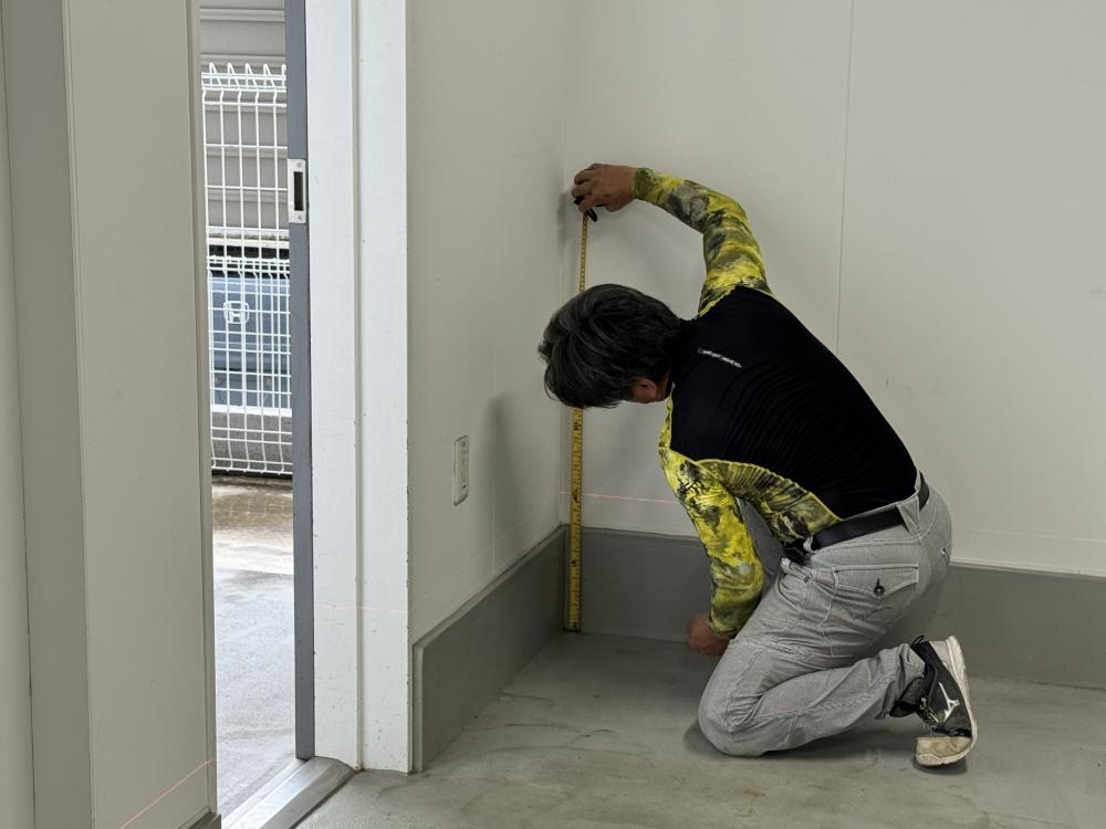 床のレベルを見ていますね。現在の床の上に棚は取り付けられます。よって床のレベルがそのまま棚に反映されてしまうのでまずは床のレベルがどうなっているのかを調べています!