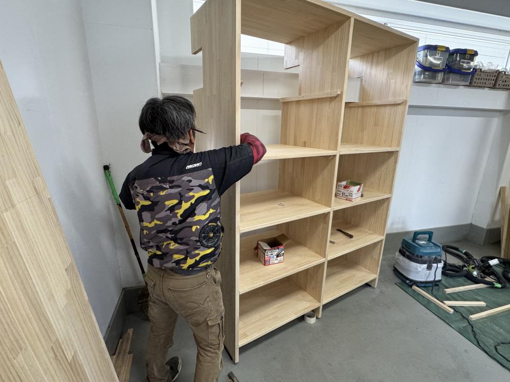 一つ目の造作棚が完成致しました!仮で設置することが出来たら、二つ目の大きい収納にとりかかっていきましょう!