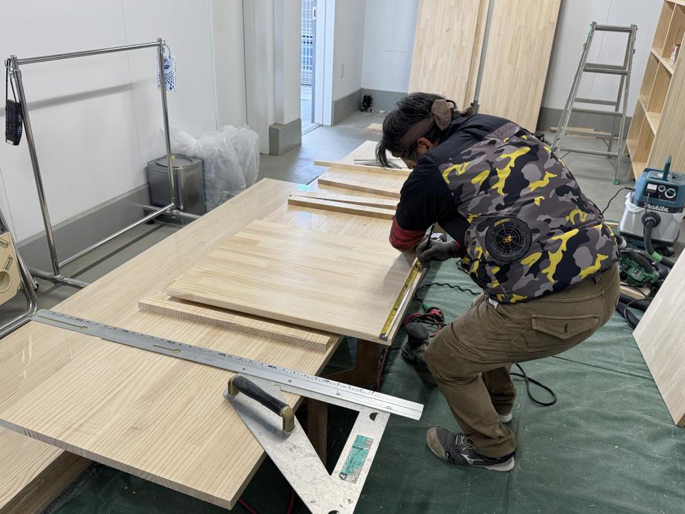 棚板をカットするために墨をつけていますね!残すは大きい棚一つ!完成に向かって順調に進んでおります!