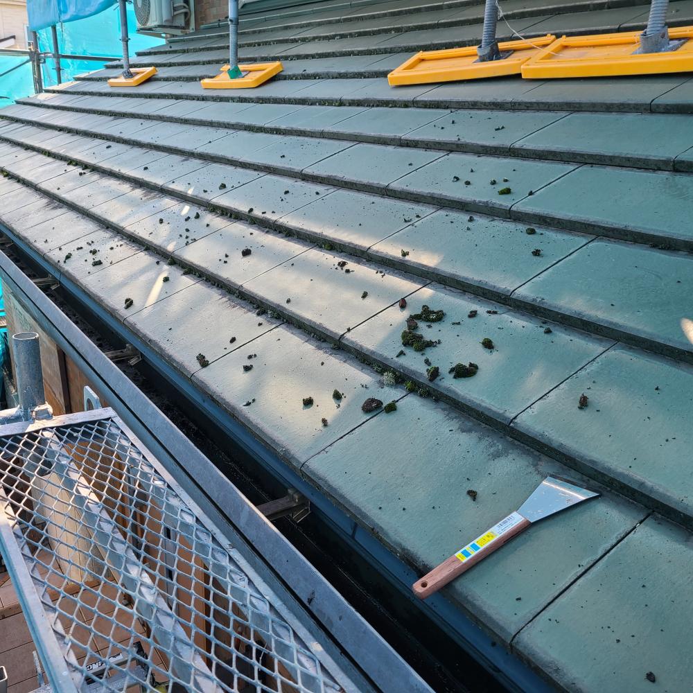 屋根材はスレート厚瓦のエアルーフドリームでした。長年の汚れやコケ、経年劣化が目立つ状況ですね。
