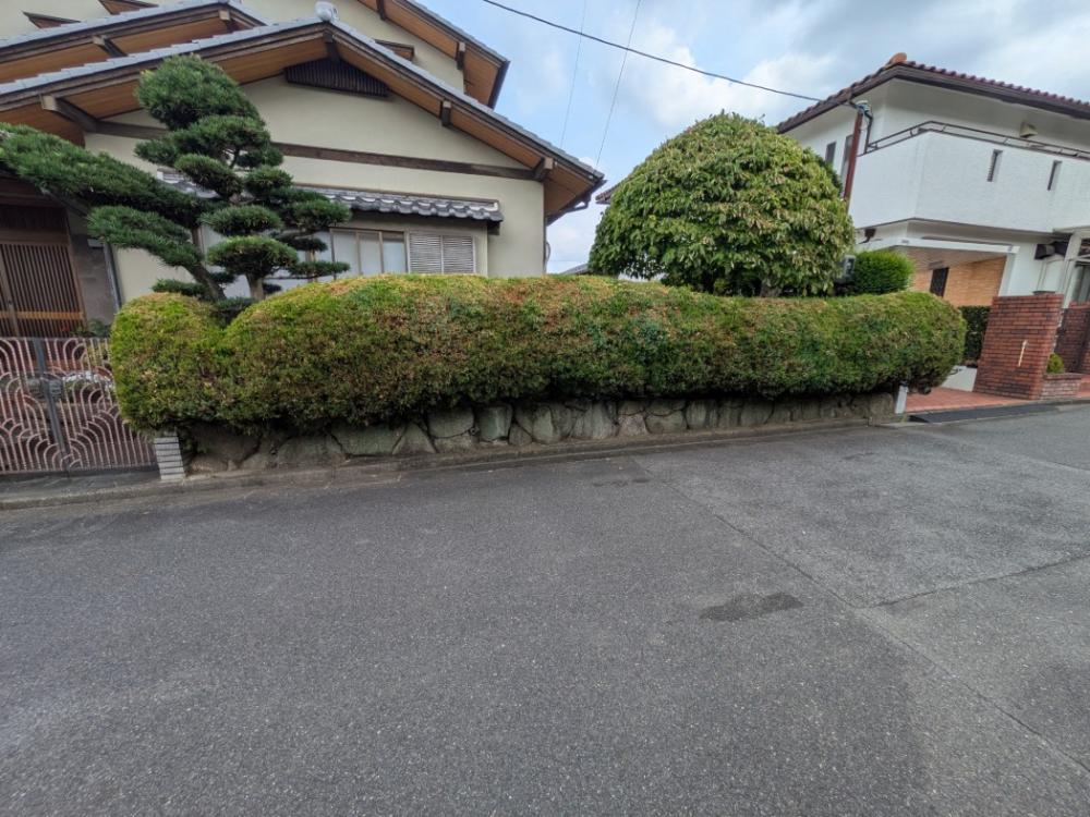工事前の状況ですね。こちらの生垣を撤去しアルミフェンスに変えていきます!