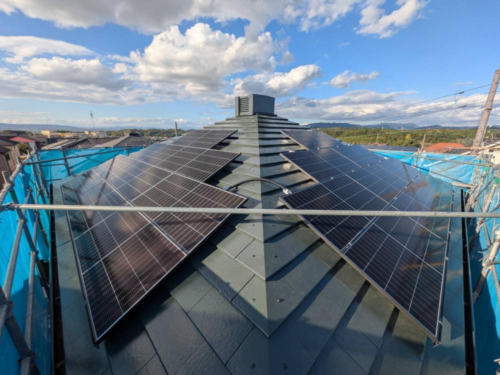 太陽光パネルの設置完了です!南面と東面合わせて5.5kwの容量です!