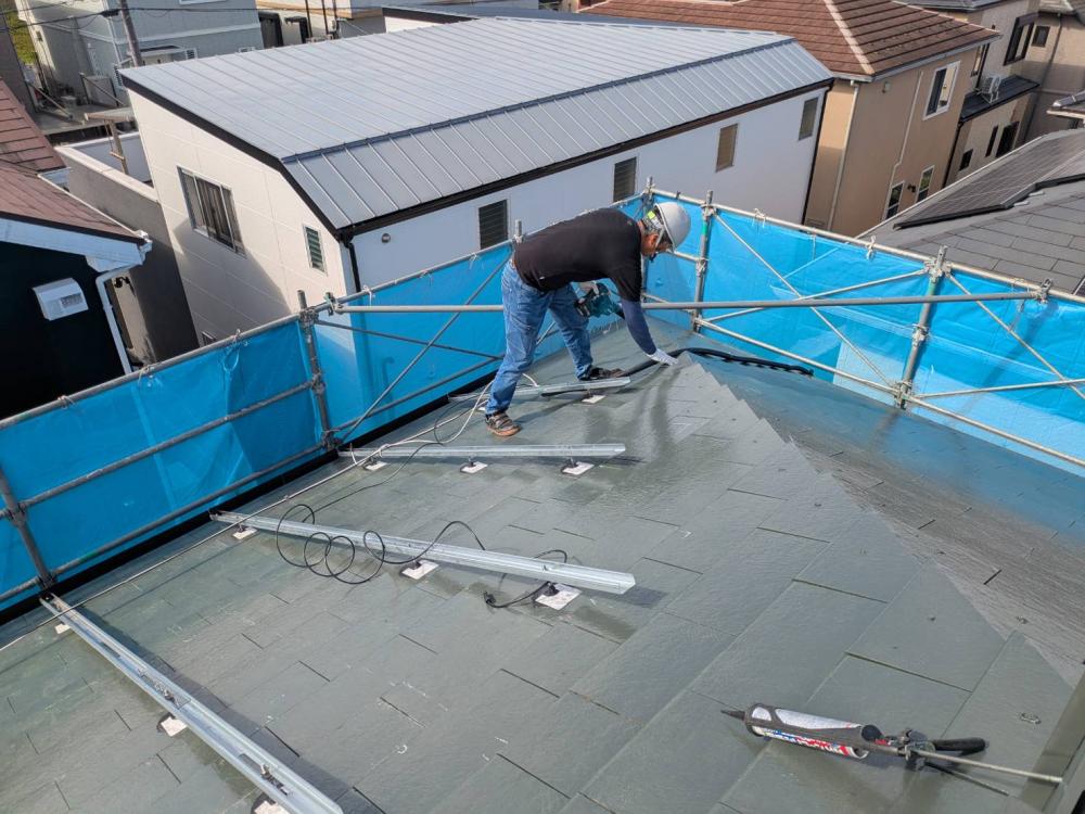 太陽光パネルを設置する下地レールの取り付けを行っていきます。
