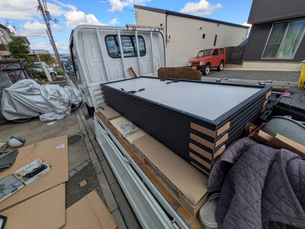 太陽光パネルが到着いたしました!一枚の重量は約15キロ、最大出力は300Wです!