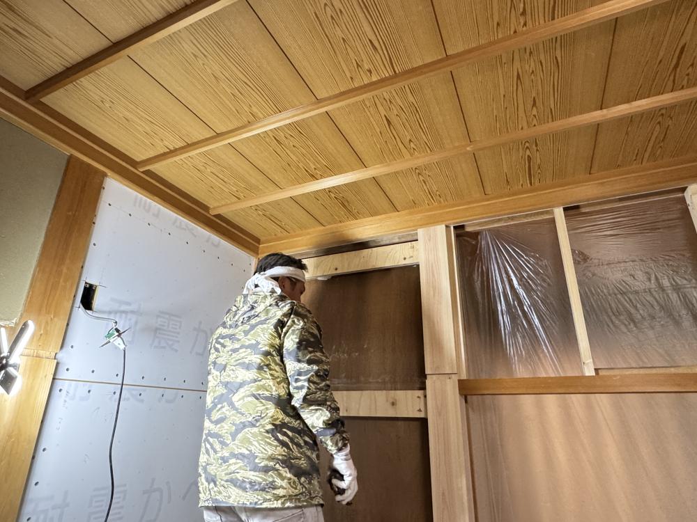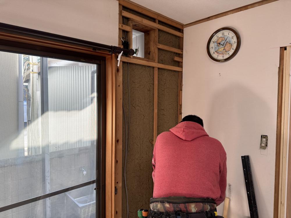 養生がしっかり出来たら続いて既存の壁を解体していきます!耐力壁に変えるために一度解体する必要があります。ここでホコリが大量に発生するので必ず養生後に施工いたします。
