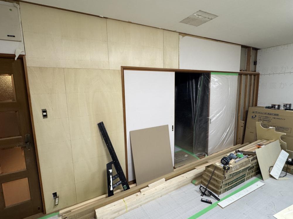 リビングも耐震補強工事完了です!耐震パネルの上から石膏ボードを貼って納めております。 この上にクロスを張っていきます。