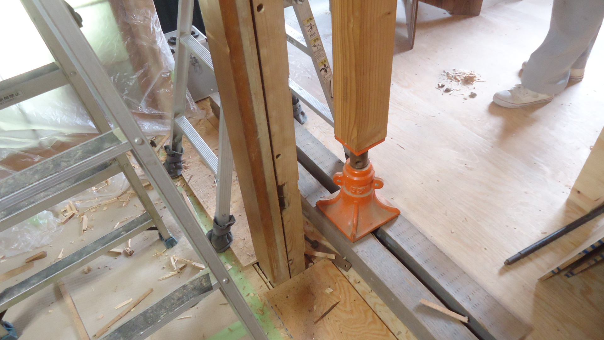 今日は前日に壁を撤去し残った柱を取り外す工事をいたしました。この柱を取ることで今まで別々であったお部屋が一つににつながります!この柱に現在かかっている荷重を別の柱で受けそのすきに取り外しを行い大きな梁を設置してその上に柱を載せるという工事です。慎重に進めないといけない工事なので緊張の一日でした!