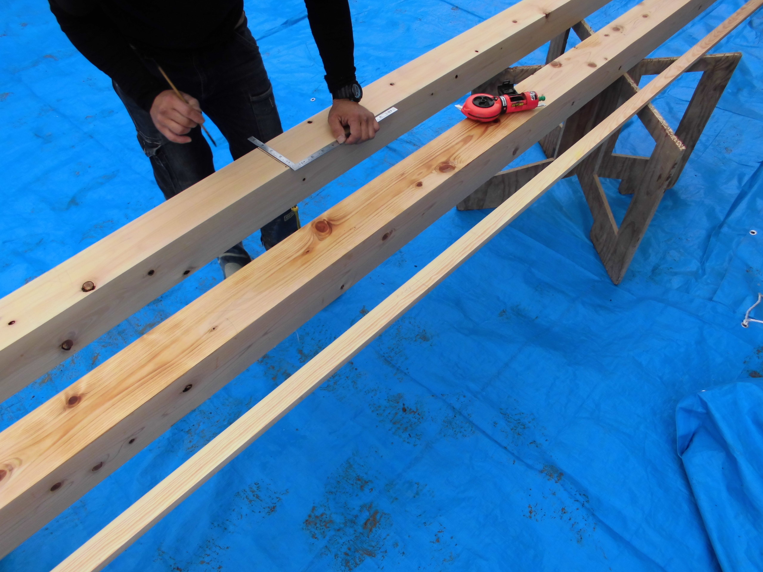 寸法を確認しながら材料に細工をしていくための墨を付けていきます。この墨付けですべてが決まるので慎重に進めていきます!