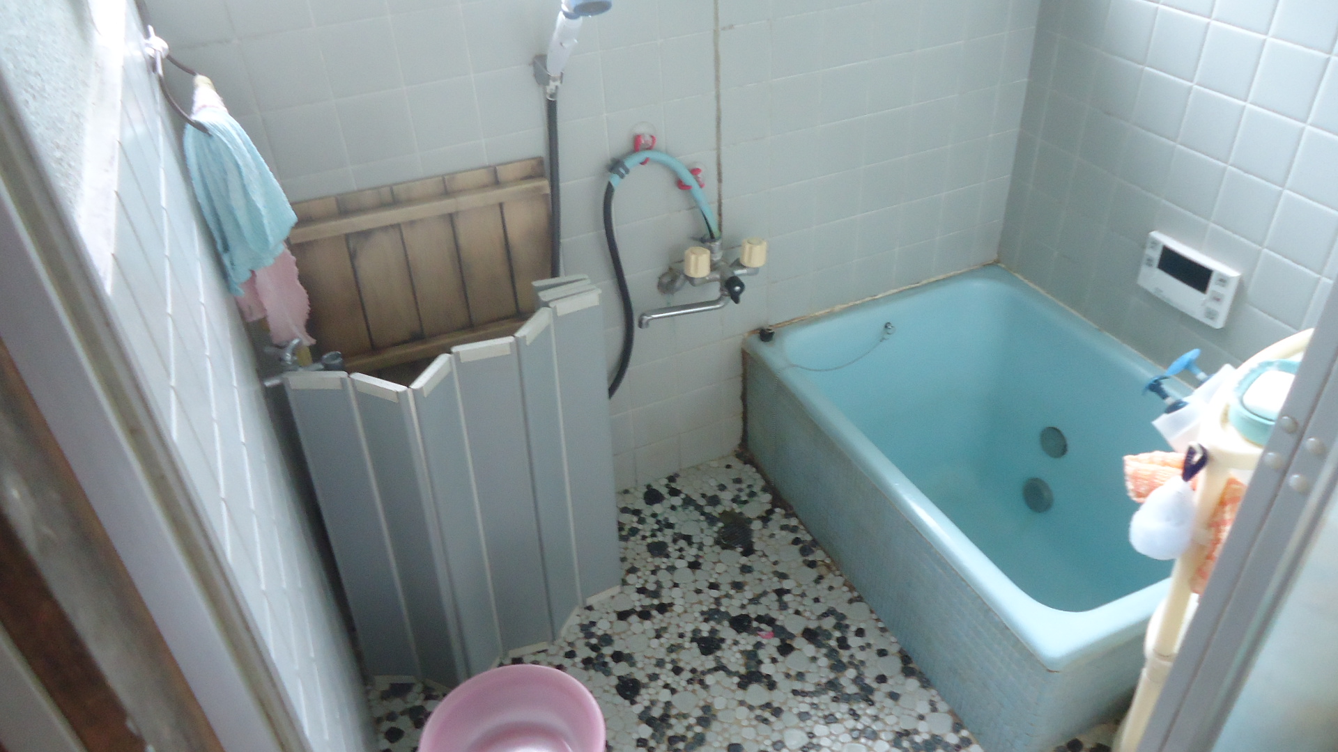 木造住宅のタイル張りのお風呂をユニットバスにリフォームします!今日は新しいユニットバスを設置するための解体工事です。周りのタイルをはがして古い浴槽も取り外していきます!