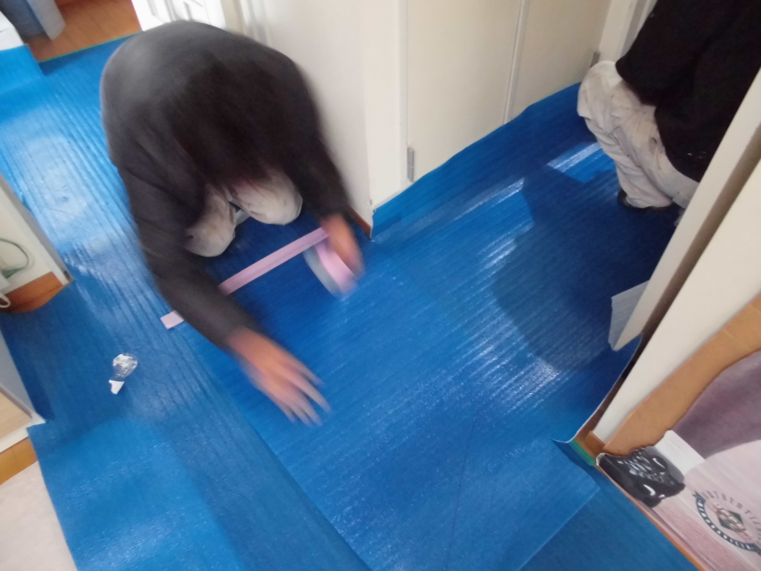 まずはここからですね。床や壁を搬入の際に傷を付けないようにしっかりと養生をしていきます。