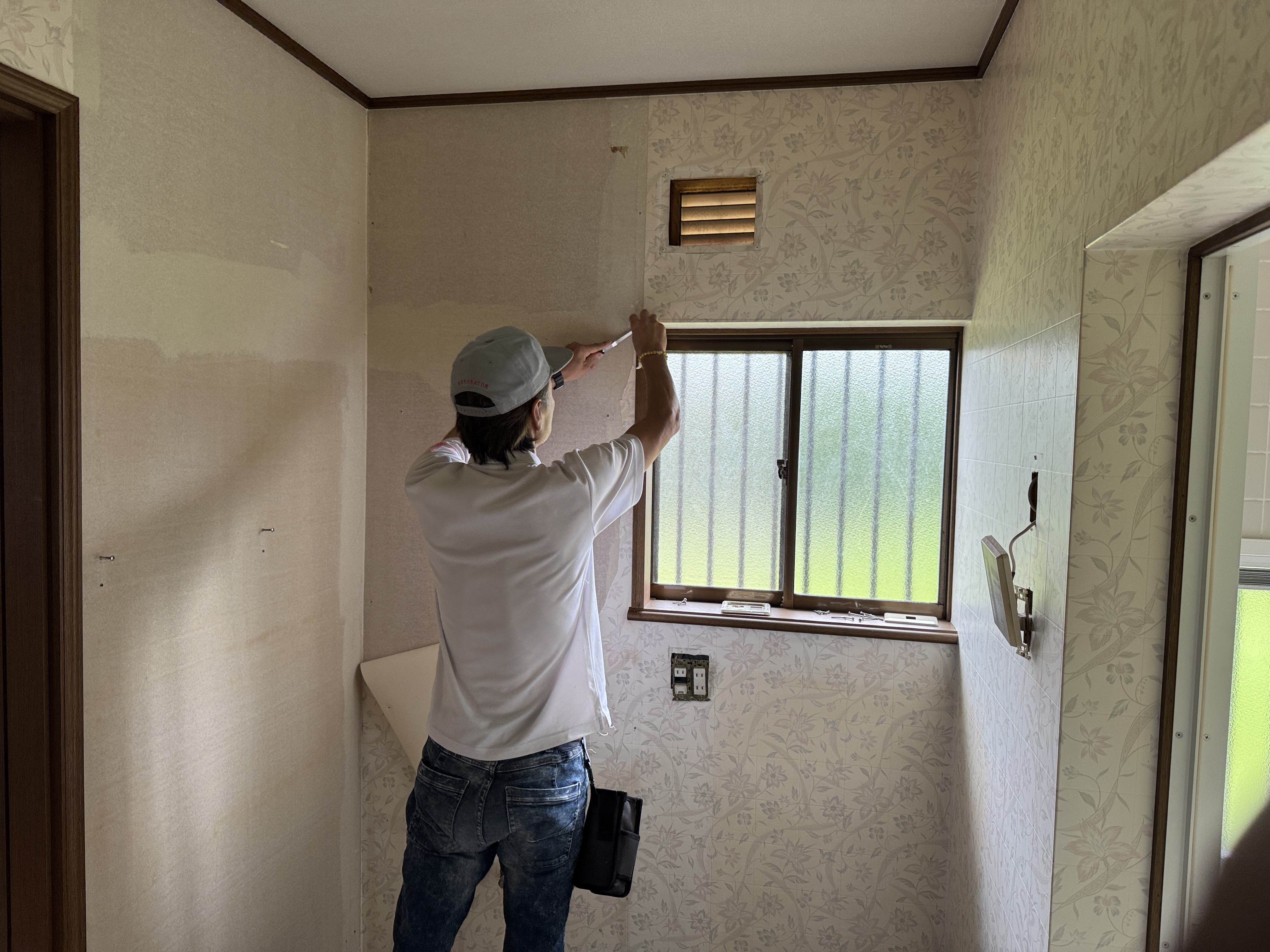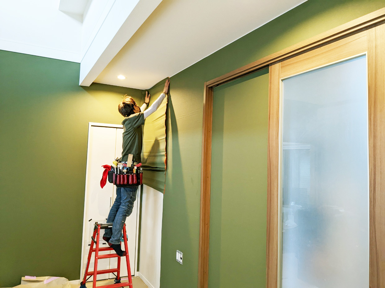 柄合わせ、空気抜き、継ぎ目処理などを丁寧に行いながら、壁一面ずつ仕上げていきます。